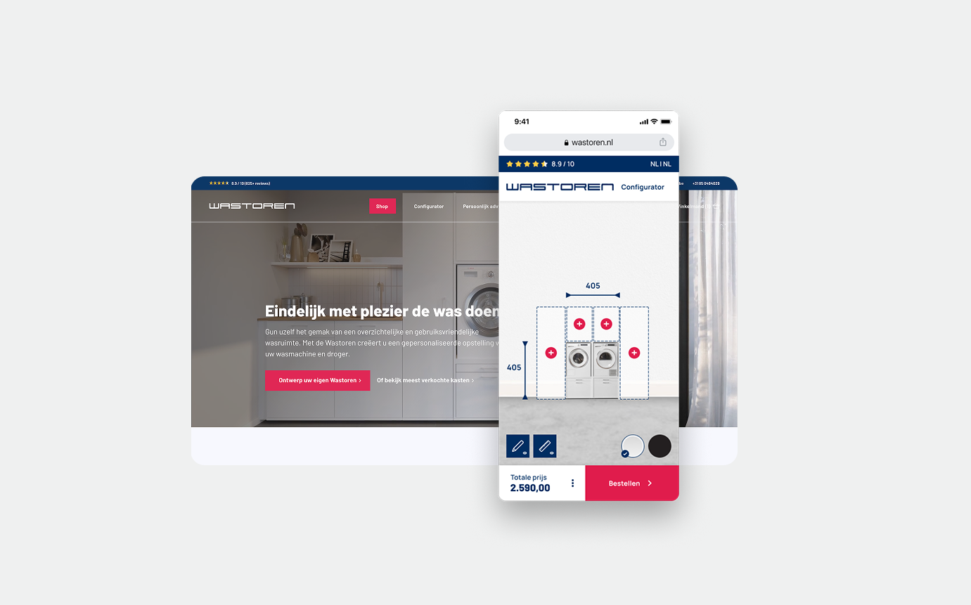 De configurator werd het hart van de webshop, met als doel het koopproces te veranderen. En nu een aantal jaar verder kunnen we zeggen dat dit nog beter heeft uitgepakt, dan we destijds hadden kunnen hopen. Wastoren® ziet namelijk dat consumenten, sinds de configurator, grotere orders plaatsen. Simpelweg omdat de drempel is verlaagd.